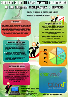 Objetivo general: Definir un Sistema de Información Ejecutivo (EIS) para los sectores de producción y comercio al detal de las MIPYME Colombianas que trabajan bajo el ERP libre Openbravo, identificando las dimensiones que se deben monitorear y el conjunto de indicadores clave (KPI) que conforman el Cuadro de Mando Integral para cada uno de los segmentos de estas MIPYME, que permita el apoyo y facilite la toma de decisiones a los gerentes de las empresas de estas características.
